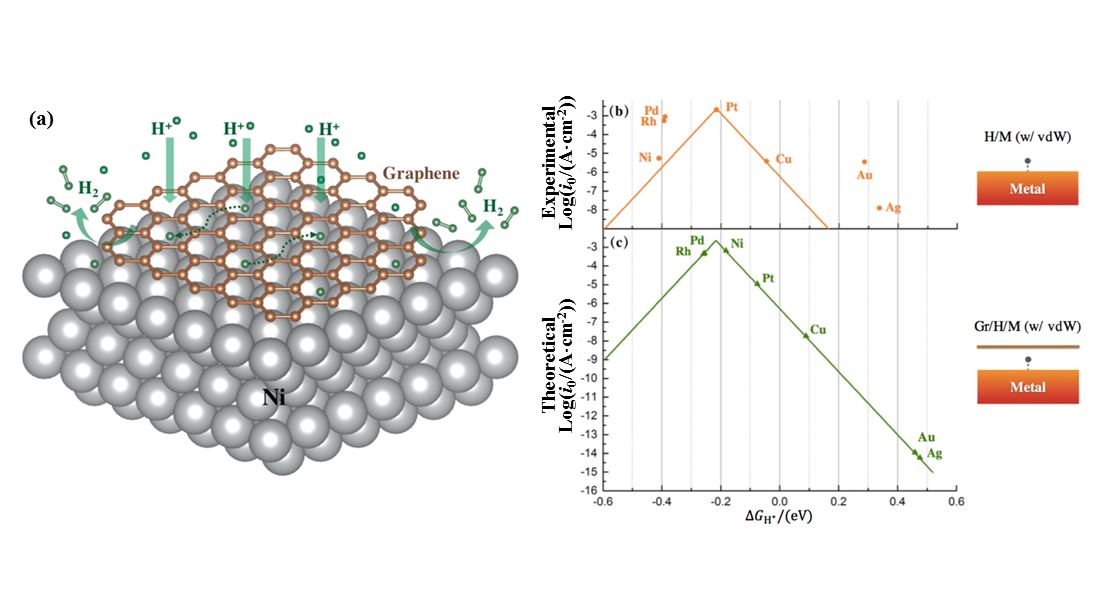 (a) 石墨烯加强镍表面催化析氢反应示意图;(b) 范德瓦耳斯力修正的不同金属表面的析氢催化活性的火山型曲线;(c) 理论预言的石墨烯覆盖后不同金属表面的析氢催化活性的火山型曲线。
