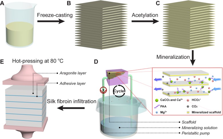 (D)流动矿化法生长碳酸钙晶体;(E)蚕丝蛋白浸渍及热压
