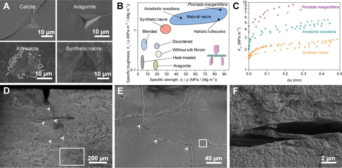 (A)纳米压痕实验表明微观尺度上天然珍珠层和人工珍珠层都有很好的抗裂纹能力;
