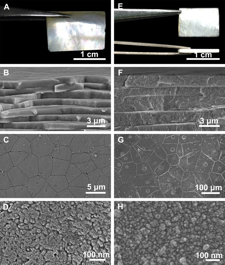 人工珍珠层的外观(E),层状结构(F),泰森多边形结构(G)以及文石片颗粒状结构(H)