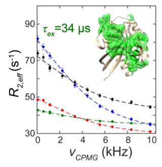 本研究中,龙冬课题组运用多种前沿核磁共振弛豫实验方法探测了Ras蛋白在不同时间尺度的构象动态性质,并定量捕捉到发生在微秒时间尺度的一项局部运动过程(交换相关时间为34微秒)。该研究工作所测定的构象动态区域与Ras上的多种共价性和非共价性抑制剂分子作用口袋分布高度相关,揭示了Ras与小分子抑制剂的特异性识别源自蛋白质在微秒时间尺度的内在运动性质,并支持了广义构象选择理论。 Ras蛋白在微秒时间尺度的动态性质先后在野生型和致癌性突变体中得到证实。这项工作为针对Ras蛋白的进一步抗癌药物研发提供了理论基础。