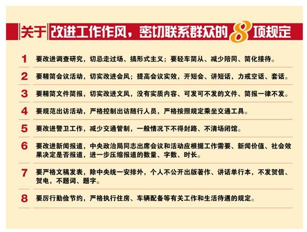 2012年12月4日,中共中央政治局会议审议通过改进工作作风、密切联系群众的“八项规定”。短短数百字的规定,开启了中国共产党激浊扬清的作风之变。
