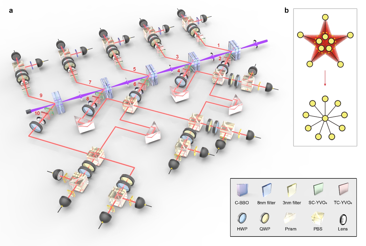 2012年,潘建伟小组首次实现了八光子纠缠,并成功将该技术应用于拓扑量子纠错和百公里量子隐形传态实验,相关成果入选《自然》杂志年度十大科技亮点。之后,对十光子纠缠的操纵就自然地成为量子信息领域的下一个重大目标。通过多年的探索,潘建伟小组制备了收集效率、保真度和光子全同性这三个制备国际综合最优的脉冲纠缠光子源,并在此基础上实现了十光子纯纠缠和可提纯纠缠态的实验制备和严格验证。这一成果将可应用于大尺度量子信息技术,表明我国在国际上继续引领多光子纠缠和干涉度量的研究。