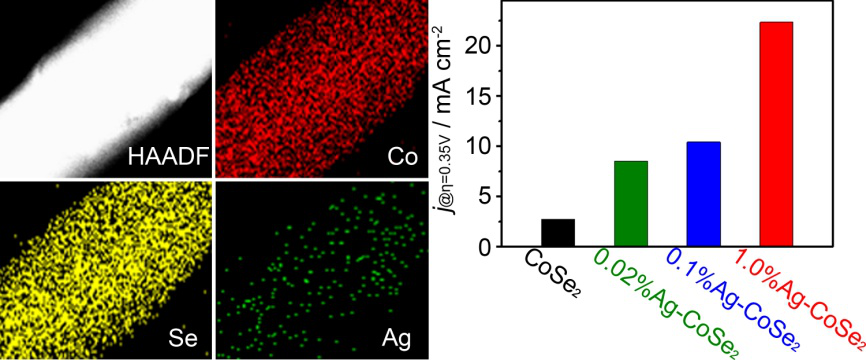 银掺杂硒化钴纳米带与电解水析氧性能。 为此,研究人员以二维层状硒化钴纳米带为基础,通过离子交换法引入微量银离子,得到了银离子掺杂的硒化钴纳米催化剂。在不破坏硒化钴自身结构的前提下,确保了活性中心即二价钴离子不发生损失,相对于硒化钴,银离子掺杂后载流子浓度提升近10倍,实现电子离域与离子离域的协同,大幅增强了催化剂材料自身导电性和催化性能。同时,由于微量离子交换导致的结构破坏程度极小,该催化剂可以在0.1M氢氧化钾溶液中循环1000次几乎不发生结构破坏与催化性能的衰减,体现出该催化剂结构高催化活性与稳定性。该项工作对于设计发展非贵金属纳米催化剂的导电性与催化性能调控提供了新思路,具有重要意义。