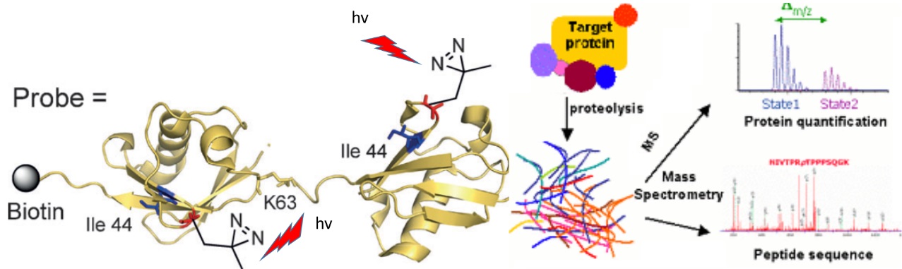泛素化修饰是蛋白质翻译后修饰中非常复杂的一类体系,目前发现存在8种多泛素连接方式,分别在泛素蛋白的Met1、Lys6、Lys11、Lys27、Lys29、Lys33、Lys48、ys63等不同位点上接入下一个泛素蛋白。这些不同类型的蛋白质多泛素修饰在细胞自噬、蛋白酶体降解、细胞信号传导及DNA损伤修复等生命活动中执行非常多样的功能。但是,目前针对多泛素蛋白的生物法制备较为困难,导致选择性识别并结合多泛素修饰的蛋白质的了解非常贫乏。近年来,中国科大田长麟实验室和清华大学刘磊实验室通过紧密合作,在蛋白质化学全合成尤其是含有特种标记、翻译后修饰的膜蛋白、蛋白质复合物的化学全合成及组装等方面取得了多项重要突破(Angew Chemie2013, 52:9558,JACS2014, 126:3695,Angew Chemie2015, 54:14276, JACS2016, 128:3553等),并于近期发展了蛋白质泛素化修饰的化学合成技术并应用于含泛素化修饰核小体的冷冻电镜(cryo-EM)结构解析(ChemBioChem2017, 18:176)。这些为基于蛋白质化学全合成制备含有光交联基团的不同类型双泛素蛋白制备和高选择性结合蛋白的质谱鉴定提供了重要基础。