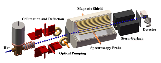 该课题组在中国科学技术大学搭建了一套氦原子束精密光谱测量装置(图2)。利用所产生的亚稳态氦原子束流,结合激光冷却原子技术大幅提高其亮度,并通过激光制备单量子态氦原子(