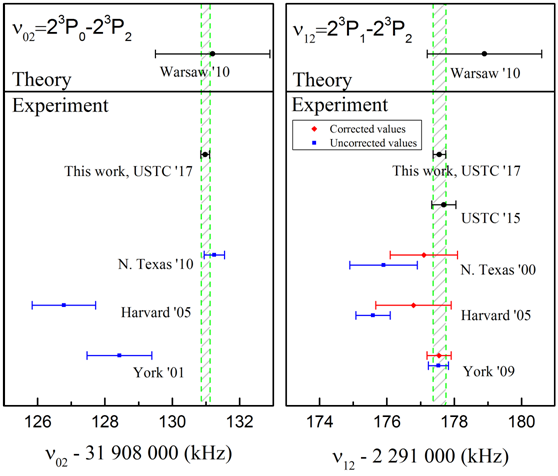 23P0-23P2和23P1-23P2分裂分别为31,908,130.98 ± 0.13 kHz和2,291,177.56 ± 0.19 kHz,是迄今最精确的测量结果。项目合作者、国际少体原子分子精密谱理论方面最著名的专家、波兰华沙大学的K. Pachucki教授认为其结果对于进一步的理论工作具有十分重要的指导意义,将把原子体系中的α常数测定提高至2×10