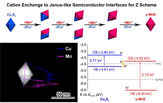 熊宇杰课题组针对该系列挑战,以Cu7S4纳米晶体为前驱物,通过阳离子交换合成路线,将其转变为Cu7S4与g-MnS构筑而成的双面神异质纳米结构。该结构不但同时满足了暴露表面和清晰界面结构要求,而且无需使用贵金属即可高效完成太阳能向化学能的转换。这两种半导体的带隙差异可以有效地实现互补型吸光,在全谱光照条件下展现出改善的光催化产氢性能。该研究进展为广谱光催化材料的设计开辟了一条新的思路,也对复合光催化剂的表界面设计研究具有推动作用。