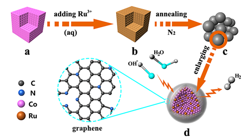 RuCo@NC纳米粒子的合成路径和结构模型示意图。(a) Co3[Co(CN)6]2,(b) Ru掺杂的Co3[Co(CN)6]2,(c) RuCo@NC纳米粒子的聚集体示意图,(d)c中一个RuCo@NC纳米粒子放大的模型示意图,并简单描述了作为电催化剂在碱性介质中的析氢过程。