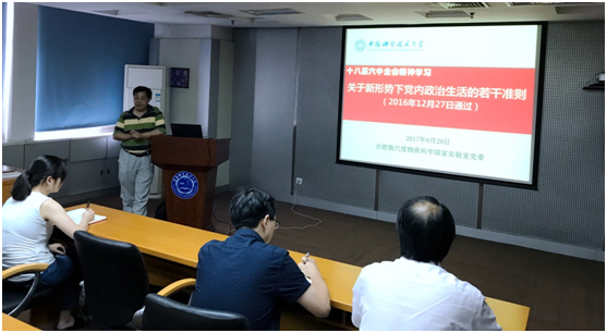 王兵同志还传达了中央“两学一做”学习教育常态化、制度化精神,并结合《安徽省高校基层党支部标准化建设方案》、《关于加强新形势下党的督促检查工作的意见》及《中共中国科学技术大学委员会关于推进“两学一做”学习教育常态化制度化实施方案》等,对微尺度“两学一做”学习教育工作进行了细化部署。要求各支部严格执行“三会一课”制度、做好党员民主评议、开好党员民主生活会及组织生活会,结合运用“两微一端”信息化平台创新组织活动形式,将基层党务工作做实做好。王兵同志还对党员信息采集工作、规范党费的缴纳和使用及党委委员联系基层支部等工作做了明确要求和部署。