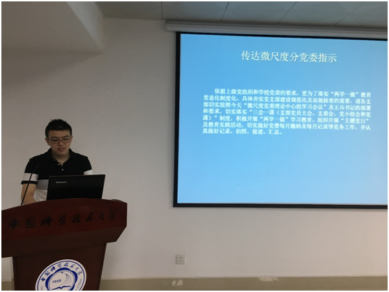王东明同志对校党委和微尺度分党委的指示进行了传达。其中,有校党委6月30日所举办的基层书记培训中所提到的内容,如中央巡视组指出“科大党建工作开展不到位”,并举出具体数据,如2/3人员不来参加党课学习等等,同时传达了校党委的最新指示,加强理论学习,促进“两学一做”常态化制度化建设。校党委书记许武指出,“中央的政治信任是我们建设世界一流大学的根本!整改是一项政治任务,没有任何讨价还价的余地!”以及微尺度分党委关于切实落实“三会一课”制度,积极开展“两学一做”学习教育,组织开展“主题党日”及教育实践活动,切实做好党费缴纳及记录等党务工作,并认真做好记录、拍照、报道、汇总的指示。