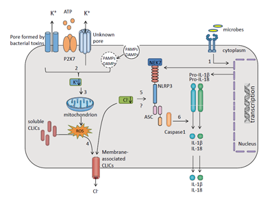 NLRP3炎症小体能够感知机体内外多种危险信号,比如高血糖、高血脂、尿酸结晶、胆固醇结晶等,但是上述危险信号诱导NLRP3活化的分子机制还很不清楚。过去的工作表明,危险信号可以诱导胞内钾离子的流失和线粒体损伤,但是胞内钾离子变化和线粒体损伤如何诱发后续炎症小体组装的分子机制尚未被揭示。该项工作发现CLICs蛋白家族在线粒体损伤产生的活性氧的诱导下能够迁移到细胞膜上,介导胞内氯离子的外流,从而进一步促进NLRP3炎症小体的组装。抑制CLICs家族蛋白的表达或者活性能够显著抑制NLRP3炎症小体活化。该项工作不仅发现CLICs介导的氯离子外流是NLRP3炎症小体组装上游的一个关键时间,还提示可以靶向CLICs靶向NLRP3相关的炎症性疾病。