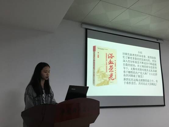 之后,李璐妍同志分享了金一南教授所著的《浴血荣光》,详细介绍了救亡图存时代,陈赓,彭德怀等几位优秀的革命将领,李璐妍同志表示“回顾先驱者的革命故事,能帮助我们了解更多我党的发展历程,更加深入的分析我党不断进步不断超越自我的原因:在正确的指导思想领导下,无数有理想有抱负无私奉献勇于牺牲的共产党人和广大人民群众共同铸就了我党!新世纪在这场无硝烟的战斗中,我们要勇于承担责任,共同见证大国崛起!”