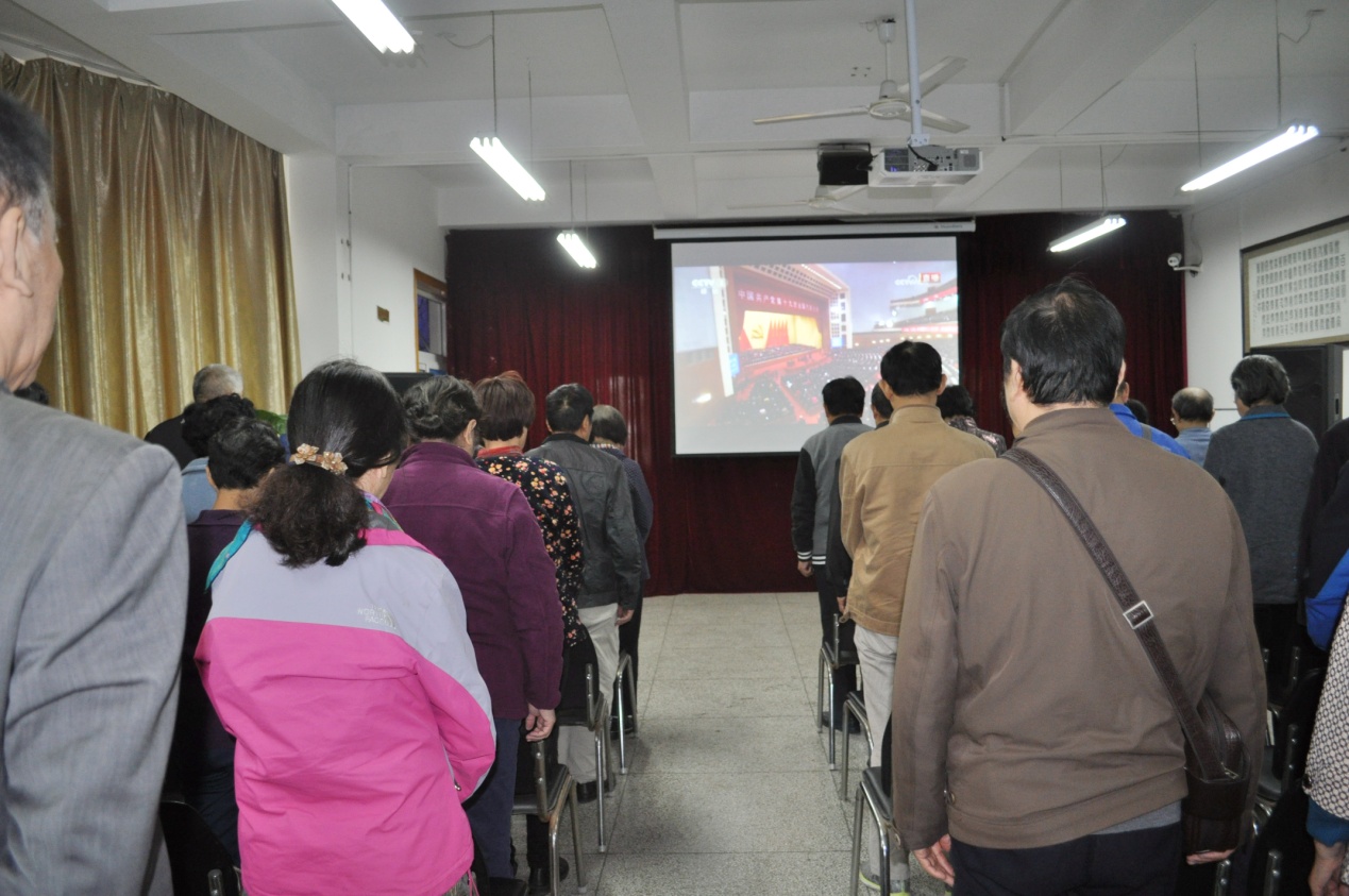 在东区离退休干部活动中心二楼多功能厅,来自我校各个离退休支部的书记、支委、片长以及离退休党总支委员、民主党派人士观看十九大开幕实况转播。