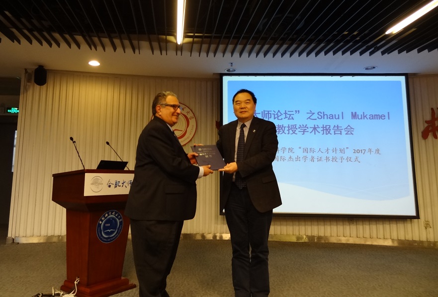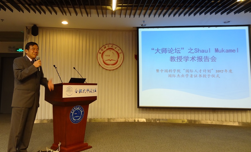 12月7日下午,著名化学家、美国国家科学院院士Shaul Mukamel教授做客合肥大师论坛,在合肥微尺度物质科学国家研究中心一楼科技展厅做题为《Study of nonadiabatic dynamic and conical intersections by nonlinear broadband X-ray spectroscopy》的学术报告。包信和校长出席报告会并为Shaul Mukamel教授颁发中国科学院“国际人才计划”2017年度国际杰出学者证书。报告会由合肥微尺度物质科学国家研究中心教授严以京主持。