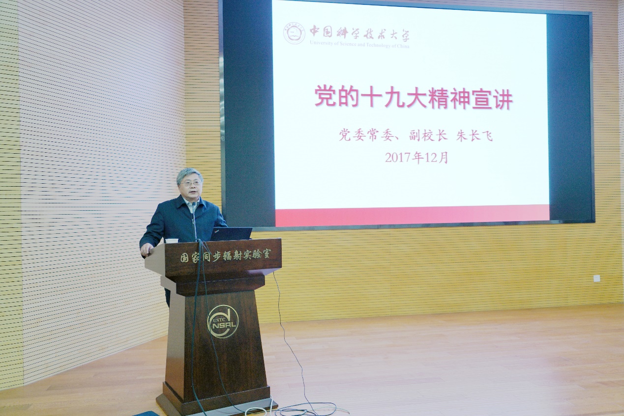 12月14日下午,按照校党委统一部署,中国科学技术大学十九大精神宣讲团成员、校党委常委、副校长朱长飞,在国家同步辐射实验室二号楼学术报告厅宣讲党的十九大精神。国家同步辐射实验室和火灾科学国家重点实验室领导班子成员、党支部书记、教工党员及学生党员代表参加了宣讲报告会。报告会由国家同步辐射实验室党委书记田扬超主持。
