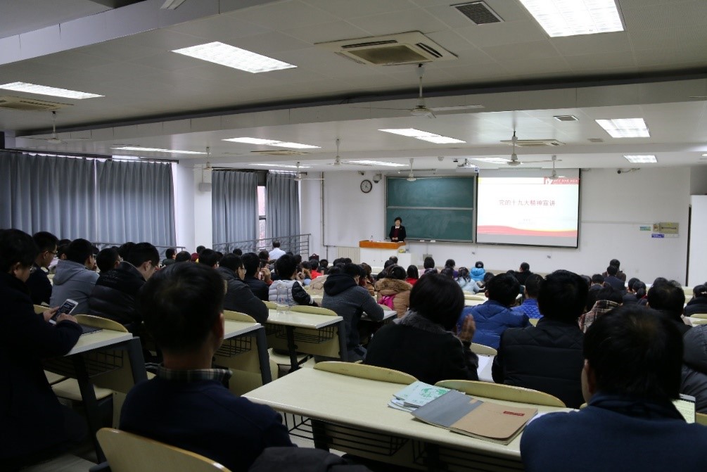 12月13日下午,按照校党委统一部署,中国科学技术大学十九大精神宣讲团成员、总会计师黄素芳,在东区五教5304教室为数学科学学院和财务处师生员工集中宣讲党的十九大精神。数学学院和财务处党政主要负责人、各党支部负责人、全体党员、师生代表参加了报告会。报告会由数学科学学院党委书记邓建松主持。