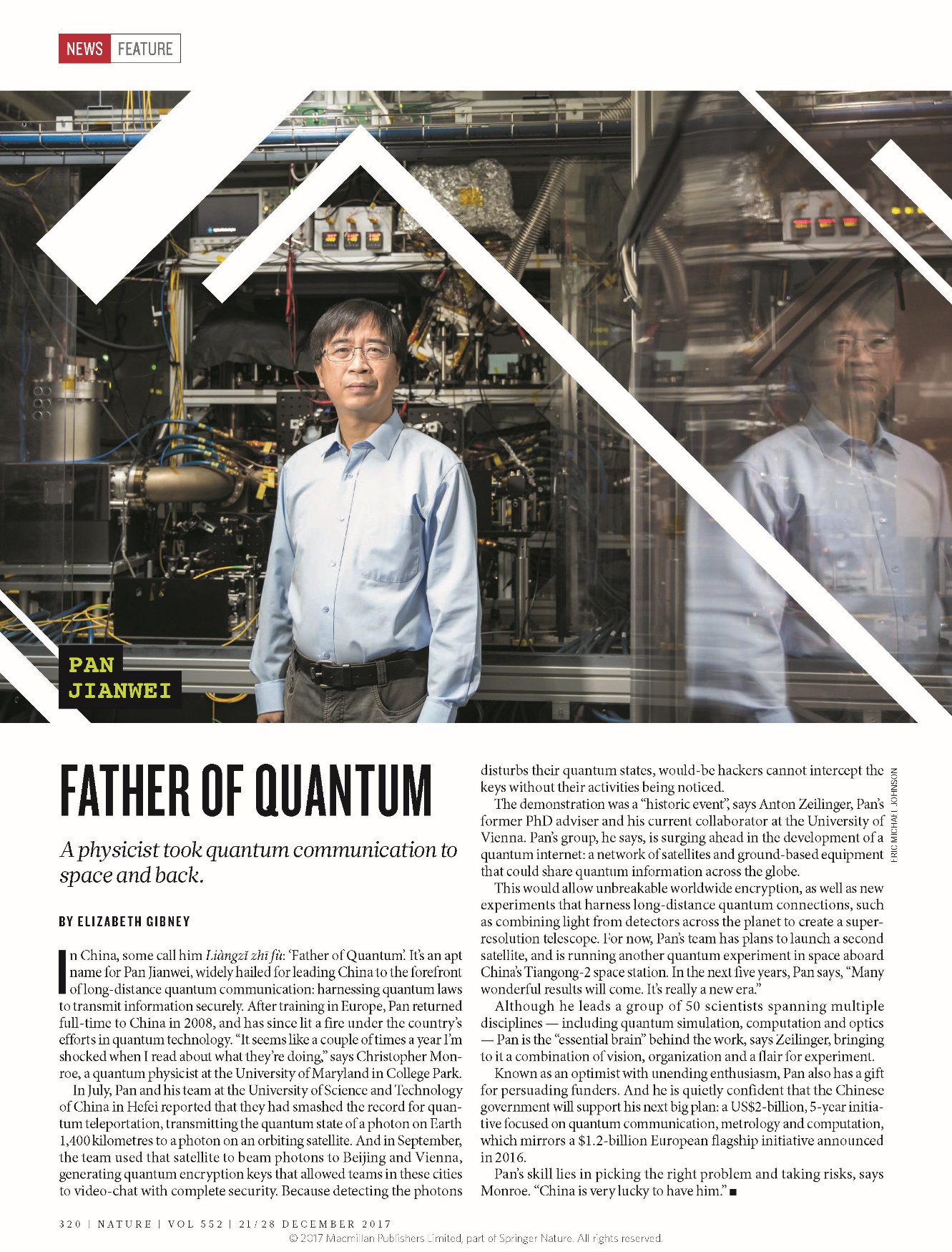 临近年底,国际学术界对过去一年里的重大科技进展进行点评,多家国际权威学术媒体对我国2017年在量子信息领域取得的研究成果给予高度评价。12月21日出版的国际权威学术期刊《自然》杂志以封面形式公布了该杂志评选的“2017年度改变世界的十大科学人物(Nature’s 10: Ten people who mattered this year)”,中国科学技术大学教授、“墨子号”量子科学实验卫星首席科学家潘建伟名列其中,并被称之为“让量子通信驰骋于天地之间的物理学家”。与此同时,同期的《自然》杂志在其点评2017年度重大科学事件时(2017 in news: The science events that shaped the year),“墨子号”量子卫星的研究成果也入选其中。《自然》杂志在其介绍专栏中指出:潘建伟“被广泛誉为引领中国走到远距离量子通信前沿的科学家”。该报道同时对中国正在酝酿的科技创新2030-重大项目“量子通信与量子计算机”进行了展望,指出该项目“将专注于量子通信、量子计算与量子精密测量,与欧洲量子技术旗舰计划异曲同工。”