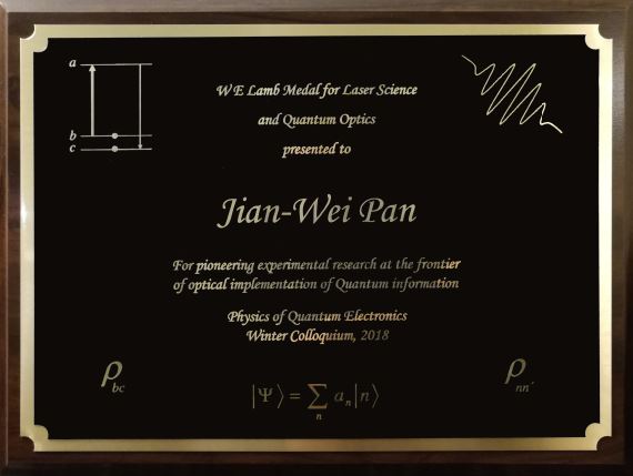 当地时间1月10日,在美国犹他州盐湖城举行的第48届量子电子物理学大会上,中国科大潘建伟教授被授予兰姆奖(Willis E. Lamb Award),以表彰他在光量子信息前沿研究领域的开创性实验贡献(for pioneering experimental research at the frontier of optical implementation of quantum information)。大会介绍潘建伟教授获奖理由时,主要提到他不仅系统的发展了多光子干涉度量学,并在实用化、远距离量子通信和可拓展量子计算等方面做出了突出的贡献。