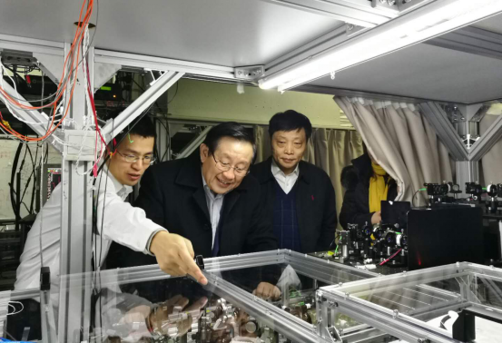 万钢在听取汇报后发表讲话。他说,这次受国务院领导同志嘱托,专程来调研量子信息科学研究与国家实验室建设进展,总结工作情况以尽快推动项目启动。围绕本次调研,万钢谈了四点意见:第一、量子信息科学将会作为电子信息产业转型升级的一个重要方向。近年来,电子信息产业增长速度与增长成本已不相匹配,如大数据存储等方面,量子信息科学为其提供了一个很好的成长方向。第二、这是一个长周期慢变量、不断渗透变化的过程,要保持长期思维,一方面不仅需要国家大力支持,也需要让社会广泛了解,集聚更多更优质的力量参与进来,形成更大效应;另一方面也要加快推进科技创新成果转化,使量子信息科技得到广泛传播和应用,营造大众共同关注、共同参与的良好氛围。第三、要有危机意识,扬长避短,充分发挥制度优势,整合创新资源,着力建设一个弘扬科学精神、尊重科学规律、集聚优势力量的开放灵活的组织结构,打造战略性国家科技力量。最后,他希望大家共同努力奋斗,不仅让我国量子科技真正实现世界称霸,也让量子通信能跟着“一带一路”走向世界。