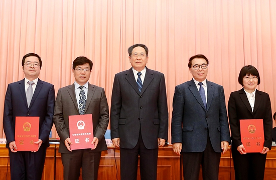 省委书记李锦斌、中科院院长白春礼为3名重大科技成就奖获得者颁奖。中国科大陈仙辉院士获2016年度安徽省重大科技成就奖,谢毅院士和中电科三十八所吴剑旗研究员获2017年度安徽省重大科技成就奖。