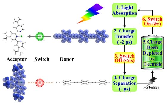 这一研究体系通过巧妙的设计抑制了有机太阳能电池中的电荷复合过程,实现了高效的电荷分离和分子导电性的自动切换,是首个自适应开关的有机太阳能电池设计。文中所报道的给体-光开关-受体体系不仅仅局限于偶氮苯和三联吡啶铂配合物分子,其他光开关分子和给体-受体体系也可以用于这一复合体系中。这一设计采用有机物小分子作为材料,解决了有机太阳能电池中容易发生电荷复合和导电性无法切换的问题,为低成本、易合成的有机分子体系大规模用于太阳能电池、光催化等领域打开了大门。