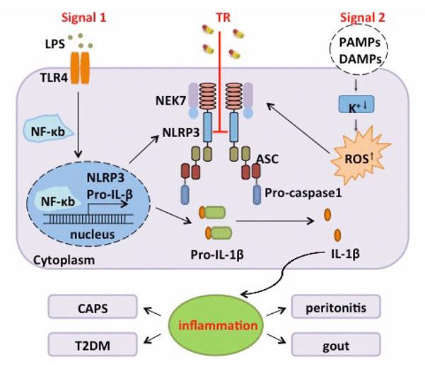 NLRP3炎症小体是由胞内固有免疫受体NLRP3、接头蛋白ASC和蛋白酶caspase-1(半胱氨酸天冬氨酸蛋白酶1)作为核心组成的多蛋白复合物,该复合物组装能够诱导促炎因子IL-1b(白细胞介素1 b)和IL-18(白细胞介素18)等的成熟和分泌,从而促进炎症反应发生。NLRP3炎症小体活化与多种人类重大疾病的发生有着密切的关系。NLRP3自身的突变会导致一类自身炎症性疾病,包括家族性寒冷型自身炎症性综合征(FCAS)、穆-韦二氏综合征(MWS) 和慢性幼儿性神经皮肤关节综合征 (CINCA)。另外NLRP3炎症小体能够被各种异常代谢产物,包括高血糖、饱和脂肪酸、胆固醇结晶、尿酸结晶、β-淀粉样蛋白等激活,所以NLRP3炎症小体在2型糖尿病、动脉粥样硬化、痛风、神经退行性疾病、多发性硬化症等疾病的发生中起重要作用,因此NLRP3炎症小体是上述疾病重要的候选干预靶点。但是目前还没有靶向NLRP3炎症小体的临床药物,所以靶向NLRP3本身的特异性抑制剂的发现受到学术界和工业界的极大关注。