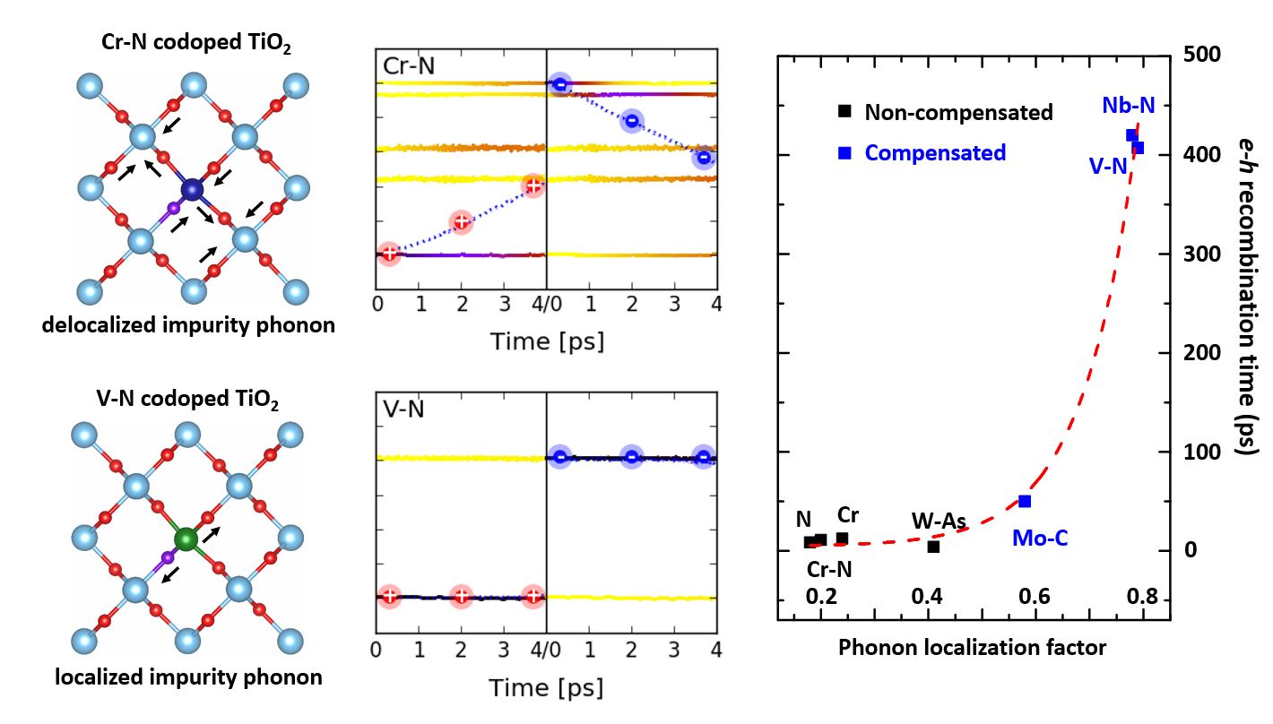 此外,赵瑾教授研究小组还研究了半导体杂质掺杂导致的激发态电子空穴的复合问题。大量的理论工作提出半导体材料中离子掺杂可以改变半导体的能隙与光吸收性质,可以用于提高半导体材料太阳能转化效率。然而,离子掺杂在改变半导体能隙的同时也引入了可能的电子-空穴复合中心,什么样的掺杂会导致电子-空穴的迅速复合迄今仍然没有人从第一性原理计算的角度给出清晰的图像。赵瑾教授研究小组以掺杂TiO2为原型材料,利用自己发展的Hefei-NAMD程序研究了掺杂半导体中的电子-空穴复合动力学及其物理机制。他们发现,掺杂离子引入的杂质声子的局域程度是决定电子-空穴复合的关键因素。以TiO2为例,非饱和共掺杂(如Cr-N掺杂)会引入非常弥散的杂质声子,与周边的TiO2原子有很强的耦合,导致电子-空穴在几个皮秒之内复合。相反,饱和共掺杂(如V-N掺杂)引入的杂质模式非常局域,与周边的TiO2原子耦合很弱,电子-空穴复合的时间尺度可以保持在纳秒量级。更进一步的计算表明,TiO2中电子-空穴复合的时间尺度与杂质声子的局域度存在指数关系,因此杂质声子的局域程度可以作为一个判断半导体材料中电子-空穴复合时间的重要因子。该研究成果发表在2018年的Nano Lett.上,物理系博士生张丽丽与微尺度物质科学国家研究中心郑奇靖博士为共同第一作者,赵瑾教授为通讯作者。两项工作得到了科技部、国家自然科学基金委、中科院等的资助。