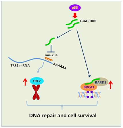 吴缅研究组发现,受p53调控的长非编码RNA GUARDIN(这个RNA由我们实验室命名,含义是指它像卫士一样护卫基因组的完整),不管在生理稳态或在遭遇毒性应激的条件下,都能参与维护基因组的稳定。GUARDIN同时通过两种机制发挥这种维护作用:1)GUARDIN作为“海绵分子(sponge molecule)”吸附微小RNA 23a (miRNA-23a),促进端粒重复序列结合因子2(TRF2)的表达,以此来维持染色体末端结构的完整性;2)GUARDIN可以作为“分子支架”增加BRCA1(乳腺癌1号基因)的稳定性,而BRCA1是基因组双链断裂的修复酶;具体分子机制是GUARDIN可以作为一个支架促进BRCA1与BARD1(BRCA1相关的RING结构域蛋白1)的结合而稳定BRCA1,维持细胞的DNA修复能力。去除GUARDIN表达后会触发细胞凋亡和衰老,同时当GUARDIN表达被抑制后,肿瘤细胞对于靶向DNA损伤的化疗药物(例如Olaparib, 一种PARP抑制剂)敏感性会增加,移植瘤的生长被抑制,这意味着GUARDIN具有潜在的抑癌效应,可能成为癌症临床药物治疗的潜在靶标。