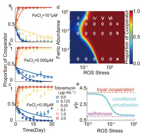 研究人员发现,当细菌在外界环境张力较小时,细菌倾向于分享公共产物(public goods),此时无私的细菌可以被自私细菌入侵而取代。但是一旦外界环境变差,如紫外线、抗生素、免疫反应等,细菌会通过主动减少公共产物的外排将载铁子私有化,这些私有化的物质(private goods)可以帮助细菌抵抗环境张力度过难关,自私菌因为没有载铁子的保护而被淘汰。这种特有的策略被称之为“条件性的私有化”。研究人员后续通过演化实验以及理论计算证明,条件性的私有化可以保护细菌的合作不被自私细菌入侵。条件性私有化机制的阐明对理解微生物合作的起源、演化、稳定具有重大意义,同时对治疗绿脓杆菌介导的感染提供有趣的新思路,即通过干扰条件性的私有化,利用“无间道”的方式破坏、瓦解细菌见的合作,从而在宿主内清除致病菌。