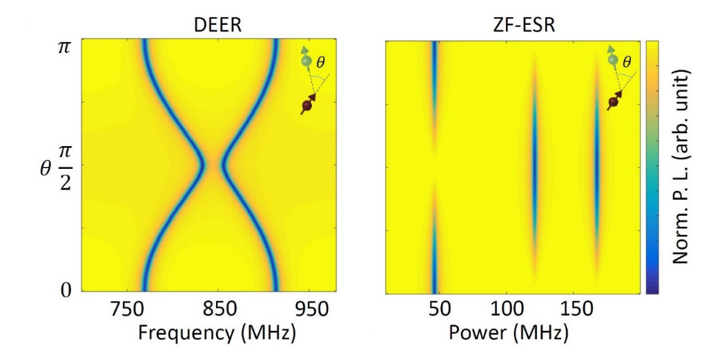 非零场(左)和零场(右)顺磁共振谱的对比图。可以看出与非零场下谱峰位置依赖分子取向不同,零场下谱线位置始终不变,使得不同取向的分子的叠加信号保持清晰。