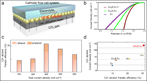 利用流动电解池设备解决了二氧化碳传质限制,促使这一核-壳-空位铜纳米催化剂的多碳醇法拉第转换效率达到32 %、转换速率超过120 mA cm