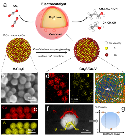 然而,以往的策略大多关注于C-C偶联反应步骤,能否通过调控C-C偶联之后的竞争反应以提高醇类燃料的选择性仍然是一个谜。研究人员利用密度泛函理论模拟预测核-壳(硫掺杂铜-空位铜)纳米结构有利于CO2还原过程中反应路径的选择,通过抑制乙烯的产生从而促进电化学合成多碳醇。基于课题组在硫化物纳米晶的合成方法所积累的工作基础(Chem. Commun. 2012, 48, 9762-9764),通过胶体成核方法,合成了一种缺陷可控的硫化亚铜纳米晶(V-Cu2S, V: Cu vacancy),之后再利用原位电化学还原方法,成功研制了一种新型核-壳-空位铜(Cu2S-Cu-V)纳米催化剂(图1)。