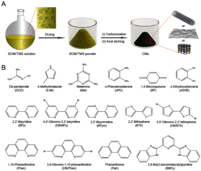 (A)过渡金属辅助碳化有机分子制备碳纳米材料的示意图;(B)该方法所使用的有机小分子前驱物的结构