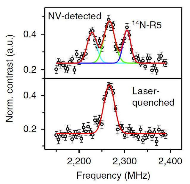 左图:实验方案示意图。基底为钻石单晶,为提升光学性质,微纳加工得到圆柱形阵列,钻石传感器位于表面下方数纳米,DNA分子“拴”在圆柱端面上,并置于水溶液中。右图:实验测得的单个DNA分子的磁共振谱,三条峰为氮氧自由基和氮核自旋的超精细耦合所致。