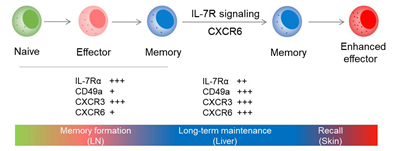 利用接触性超敏反应模型,课题组发现半抗原致敏能够将IL-7Rα+ ILC1s招募至皮肤引流淋巴结,该过程依赖趋化因子受体CXCR3。进入引流淋巴结后,ILC1s迅速应答半抗原,分泌大量IFN-γ和TNF,表现出活化的状态。致敏后48小时,淋巴结ILC1s数量达到峰值;72小时,淋巴结ILC1s获得对特定半抗原的免疫记忆潜能。随后,记忆性ILC1s依赖S1PR1迁出引流淋巴结;通过其表面的CXCR6与肝窦中丰富的CXCL16相互作用,记忆性ILC1s得以驻留在肝脏中。此外,肝窦中的IL-7对于记忆性ILC1s的长期存活具有重要作用。当机体再次遭遇特定抗原时,肝脏驻留的记忆性IL-7Rα+ ILC1s能够迁移到效应部位,介导皮肤局部的炎症反应。综上,该研究鉴定了一群具有免疫记忆功能的ILC1s亚群,记忆性ILC1s在淋巴结中形成,而在肝脏中长期驻留。这项工作对于“ILC Memory”这一新兴领域的研究提供了新的视角。