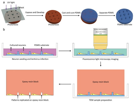 在本研究中,合作课题组研发的光电关联显微成像技术,是通过将原代海马神经元培养在微图案编码的PDMS细胞培养基底上,在对特异性标记的突触进行荧光成像后,进行电镜制样和电子显微成像。PDMS基底上的图案编码了突触所在区域,并且为光学显微图像和电子显微图像的配准提供了精确的参照。另外合作课题组研发了用于自动电镜图像采集,光学显微和电子显微图像配准以及电镜导航的光电关联显微成像软件。利用这一软硬件结合的光电关联显微成像系统,合作课题组获取了高质量的荧光标记的兴奋性树突棘和树突干突触的电子断层扫描图像。