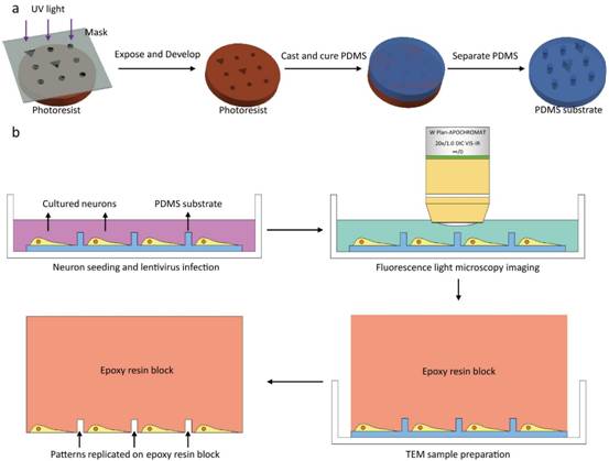 在本研究中,课题组自主设计了具有微图案编码的聚二甲基硅氧烷(PDMS)细胞培养基底。将细胞直接培养该PDMS基底上,利用微图案编码作为索引和基准点,可高精度实现对同一样品中同一个区域的光学显微与电子显微关联成像。同时,合作课题组开发了光电关联显微成像软件,能够自动化实现基于荧光显微成像导航的电子显微成像。利用这一光电关联显微成像系统,课题组对离体培养的海马神经元中兴奋性树突棘和树突干突触的超微结构特性进行了系统分析。这一关联显微成像技术,能够实现将活细胞成像等多种光学显微成像与基于包埋切片的常规电镜或冷冻电镜成像的高精度关联,可广泛应用于细胞与神经生物学研究。