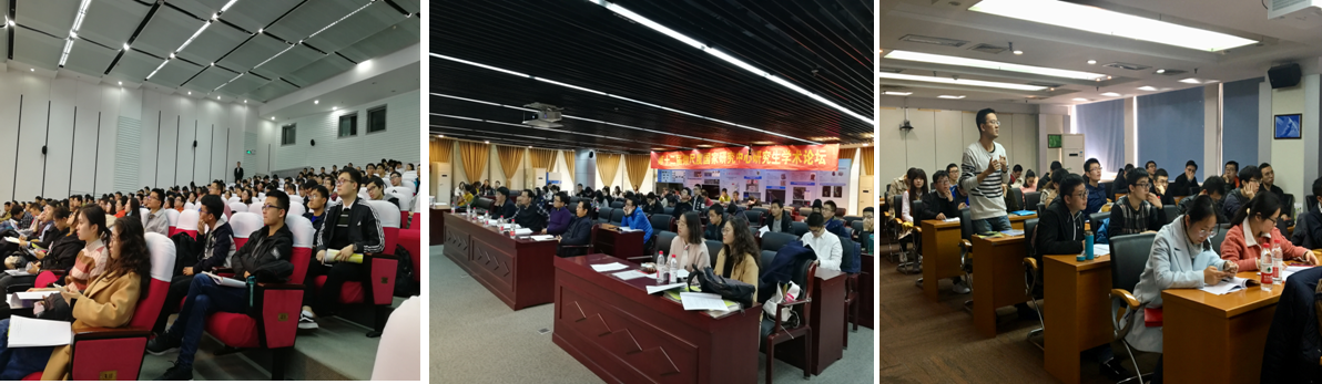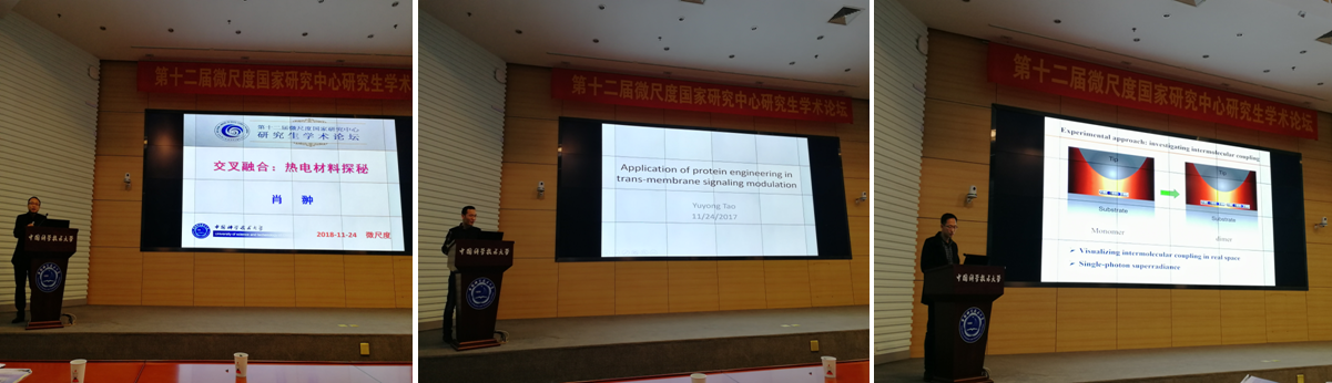 开幕式之后,论坛进入大会特邀报告环节,来自微尺度原子分子科学研究部的张杨教授首先做了题为“Exploring Single-molecular Optoelectronicswith STM Induced Luminescence Technique”的报告,他结合自己的科研经历阐述了如何一步步做好创新工作。接着纳米材料与化学研究部的肖翀教授带来了题为“交叉融合:热电材料探秘”的学术报告,前沿又新颖的热电材料相关研究激发了大家的浓厚兴趣。最后,生命科学学科的陶余勇教授做了关于“Applicationof protein engineeringintrans-membranesignalingmodulation”的专题报告,他幽默生动的语言极大地活跃了现场的气氛。三位特邀教授精彩的报告为学术论坛增光添彩,同时也为接下来做报告的研究生同学树立了很好的榜样。