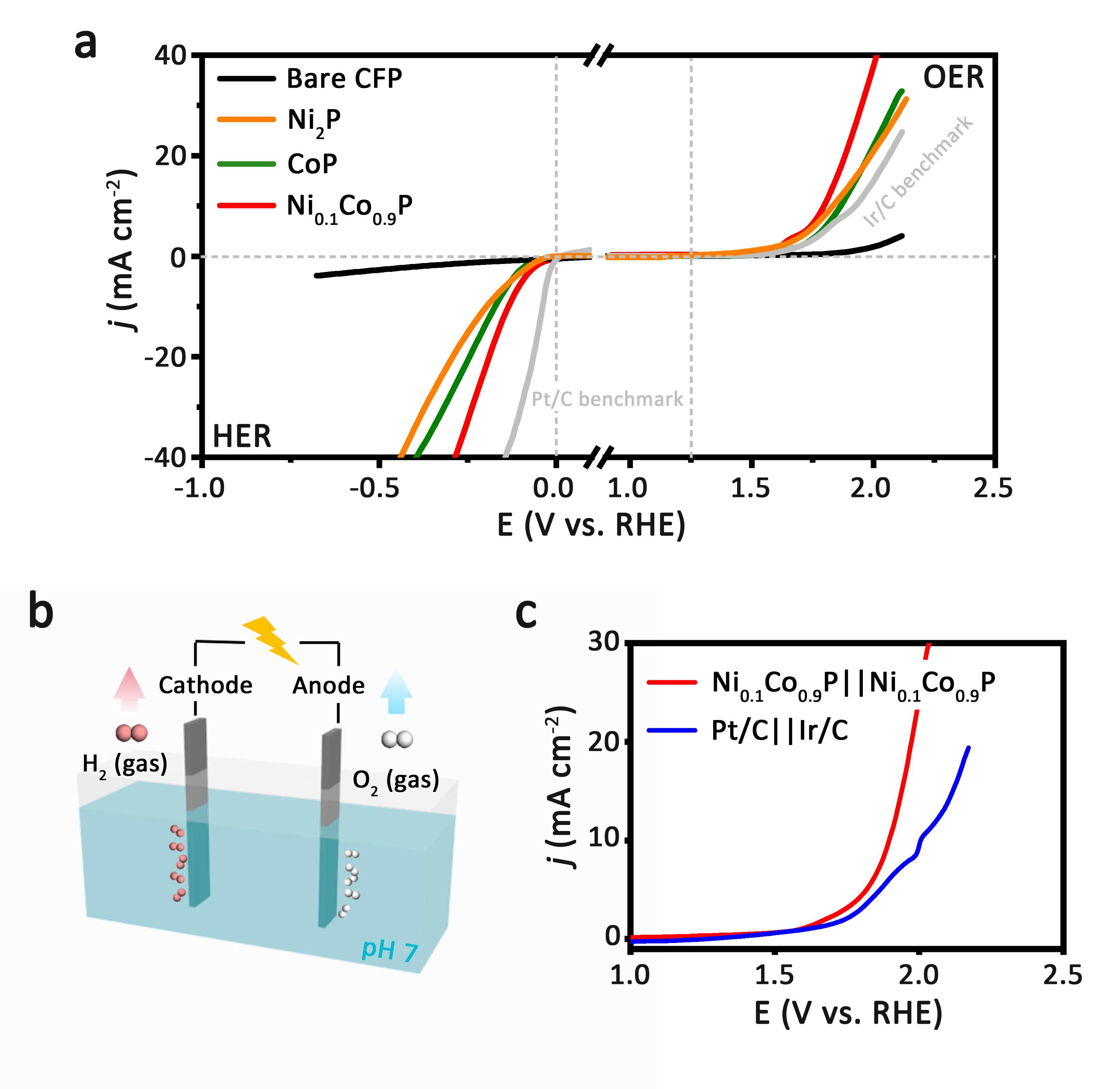 2.(a-c) Ni0.1Co0.9P三元纳米电催化剂的水氧化和水还原催化活性及其器件性能评估