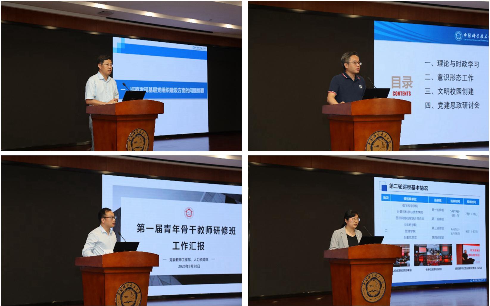 党委组织部常务副部长邓建松就党建和干部工作进行了汇报,党委宣传部常务副部长朱霁平就理论宣传和文化建设工作进行了汇报,党委教师工作部副部长曾杰就青年骨干教师研修班工作进行了汇报,党委巡察工作办公室副主任汤茜就第二轮巡察有关情况进行了汇报。