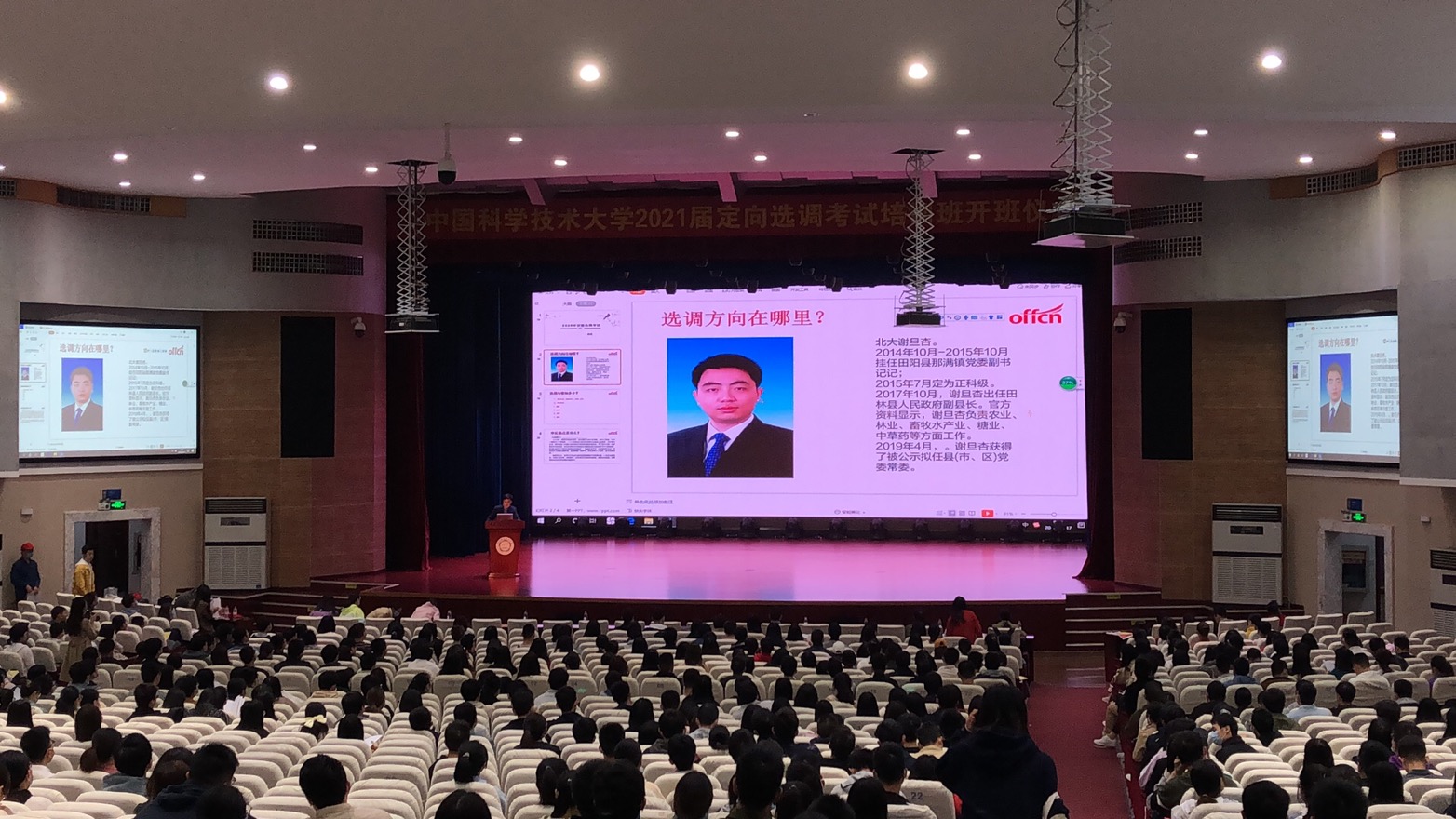 10月17日上午,由学校党委组织部、招生就业处和校团委联合举办的中国科大2021选调培训在东区大礼堂顺利举行。校党委副书记何淳宽、校党委组织部常务副部长邓建松、校团委书记杨晓果、招生就业处副处长魏英、校团委副书记杨志伟以及培训承办方安徽中公研究院副院长魏宝林等领导老师出席了开班仪式。意向参加选调的600余名同学参加了持续两天的首次培训。