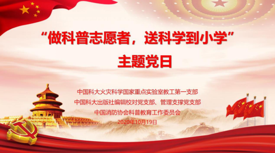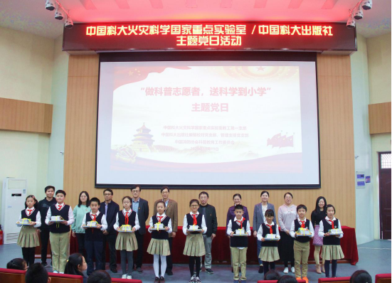 2020年10月19日,中国科大火灾科学国家重点实验室教工第一党支部(以下简称“火灾实验室教工一支部”)联合中国科大出版社编辑校对党支部、管理支撑党支部(以下简称“出版社编辑校对党支部、管理支撑党支部”)和中国消防协会科普教育工作委员会赴中国科大附属中学小学部开展“做科普志愿者,送科学到小学”主题党日活动。中国科大基础教育集团党委书记、中国科大附中校长马运生,中国科大附中党总支书记、常务副校长汤胜,中国科大火灾实验室党委书记张和平,中国科大火灾实验室副主任、教工一支部书记纪杰,中国科大出版社常务副总编李攀峰,中国科大出版社副社长李芳宇等领导和相关支部党员出席。活动由纪杰教授主持。