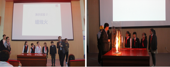 捐赠仪式后,纪杰教授为现场的同学们作了一堂生动的科普报告并带来一系列有趣的小实验:小型火旋风演示实验、蜡烛火实验、旋转的纸杯、“掌中起火”实验......面对实验中的奇特现象和纪杰教授抛出的问题,同学们争先恐后地举手发言,并在寓学于乐的过程中了解其形成机理和科学本质。