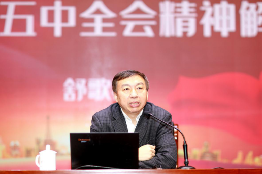 舒歌群首先回顾了十九届五中全会召开的基本情况和重大意义。党的十九届五中全会是在我国将进入新发展阶段、实现中华民族伟大复兴正处在关键时期召开的一次具有全局性、历史性意义的重要会议。会议站在党和国家事业发展全局高度,按照党的十九大对实现第二个百年奋斗目标作出的分两个阶段推进的战略安排,将“十四五”规划与2035年远景目标统筹考虑,审议通过了《中共中央关于制定国民经济和社会发展第十四个五年规划和二〇三五年远景目标的建议》,描绘了我国进入新发展阶段的发展蓝图。这是我们党统筹中华民族伟大复兴战略全局和世界百年未有之大变局,为确保中华民族伟大复兴顺利实现而进行的一次重要战略擘画,对于激励全党全国各族人民,战胜前进道路上各种风险挑战,为全面建设社会主义现代化国家开好局、起好步,具有十分重要的意义。