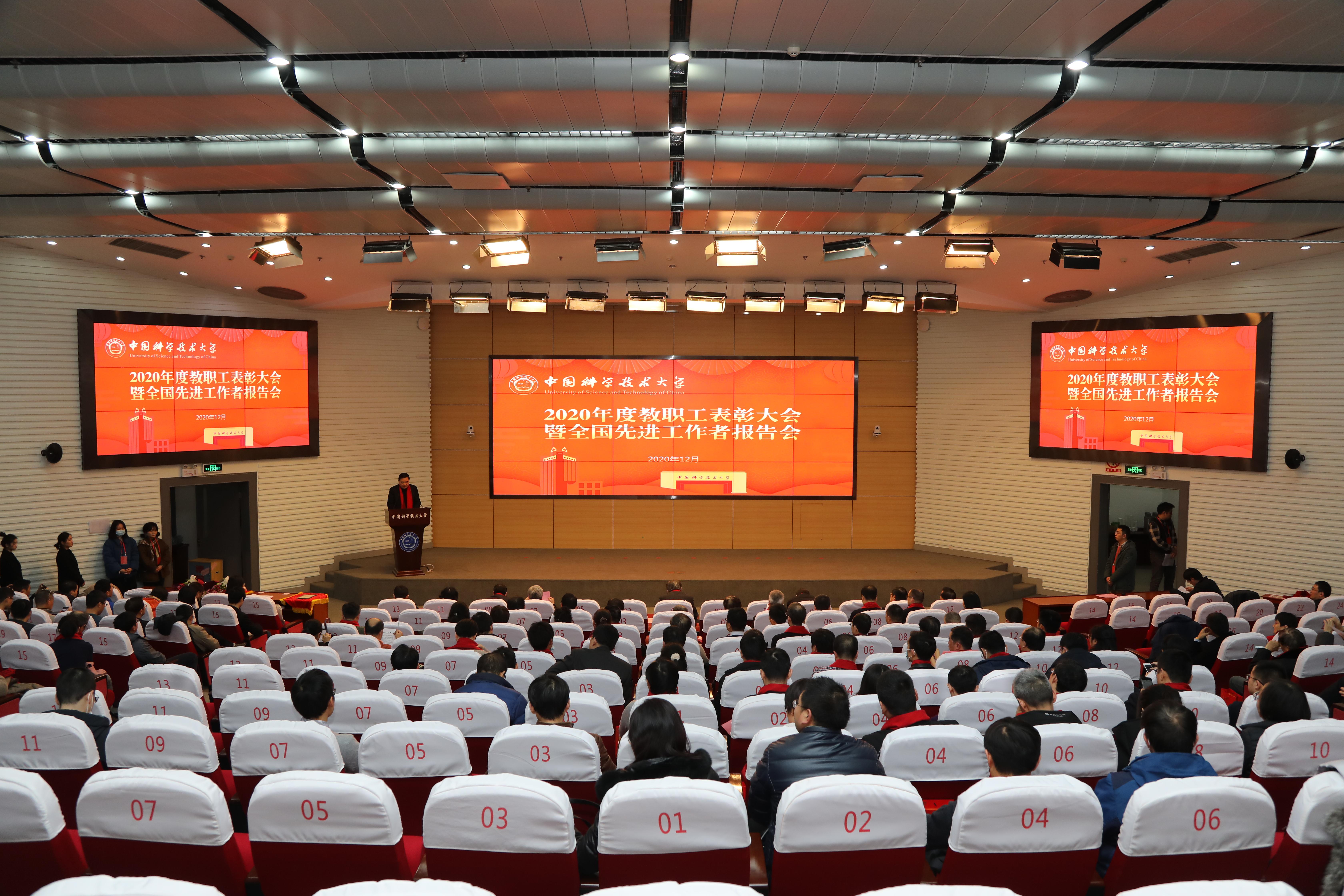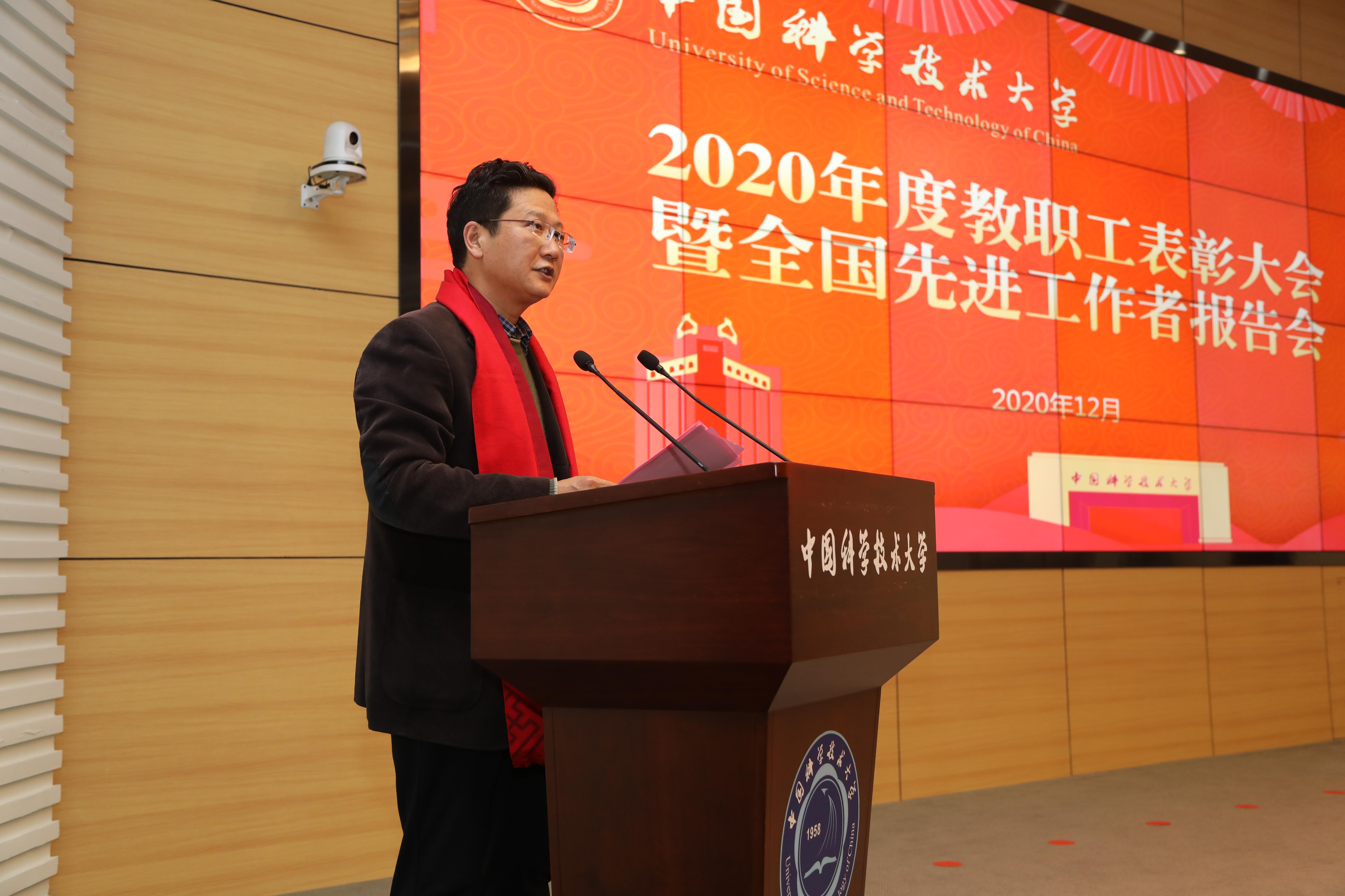 12月29日下午,我校举行2020年度教职工表彰大会暨全国先进工作者报告会。校党委书记舒歌群出席大会并讲话,校长包信和致辞。校党委常务副书记蒋一主持会议,并宣读表彰决定。校领导朱长飞、王晓平、杨金龙、杜江峰、黄素芳、褚家如、周丛照以及获奖教职工、捐赠人代表等出席会议。