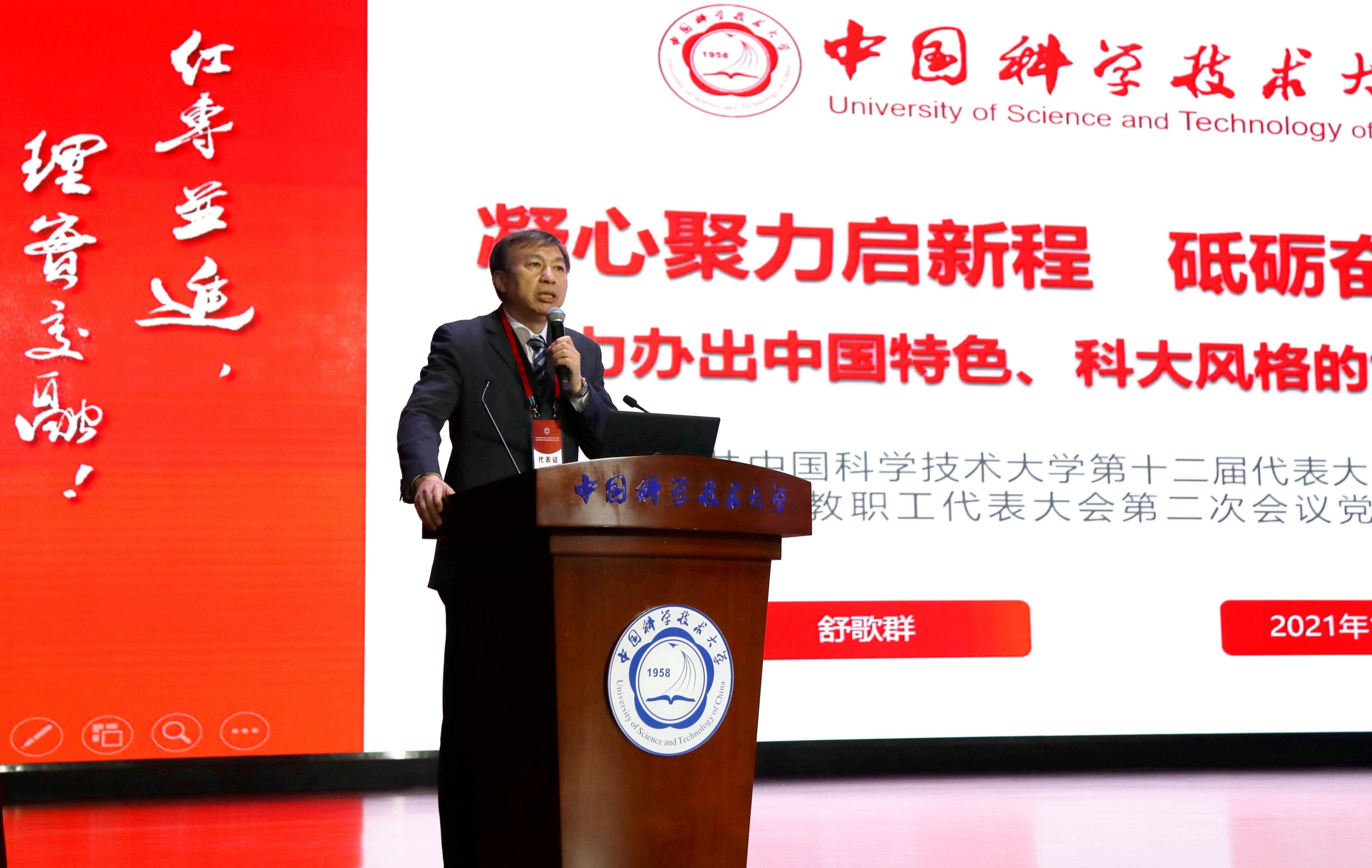 开幕式后,舒歌群作题为《凝心聚力启新程 砥砺奋进谱新篇——努力办出中国特色、科大风格的世界一流大学》的党委工作报告。舒歌群指出,2020年是中国科学技术大学南迁合肥二次创业50周年,也是学校总结“十三五”、谋划“十四五”的关键之年。一年来,在中国科学院、教育部和安徽省委省政府的领导下,校党委以习近平新时代中国特色社会主义思想为指导,深入学习贯彻落实党的十九大和十九届二中、三中、四中、五中全会精神,牢记习近平总书记嘱托,切实担负起管党治党、办学治校主体责任,带领全校各级党组织、广大党员和师生员工,不忘初心、砥砺奋进,党的建设和各项事业蓬勃发展,中国特色世界一流大学建设取得可喜的成绩。