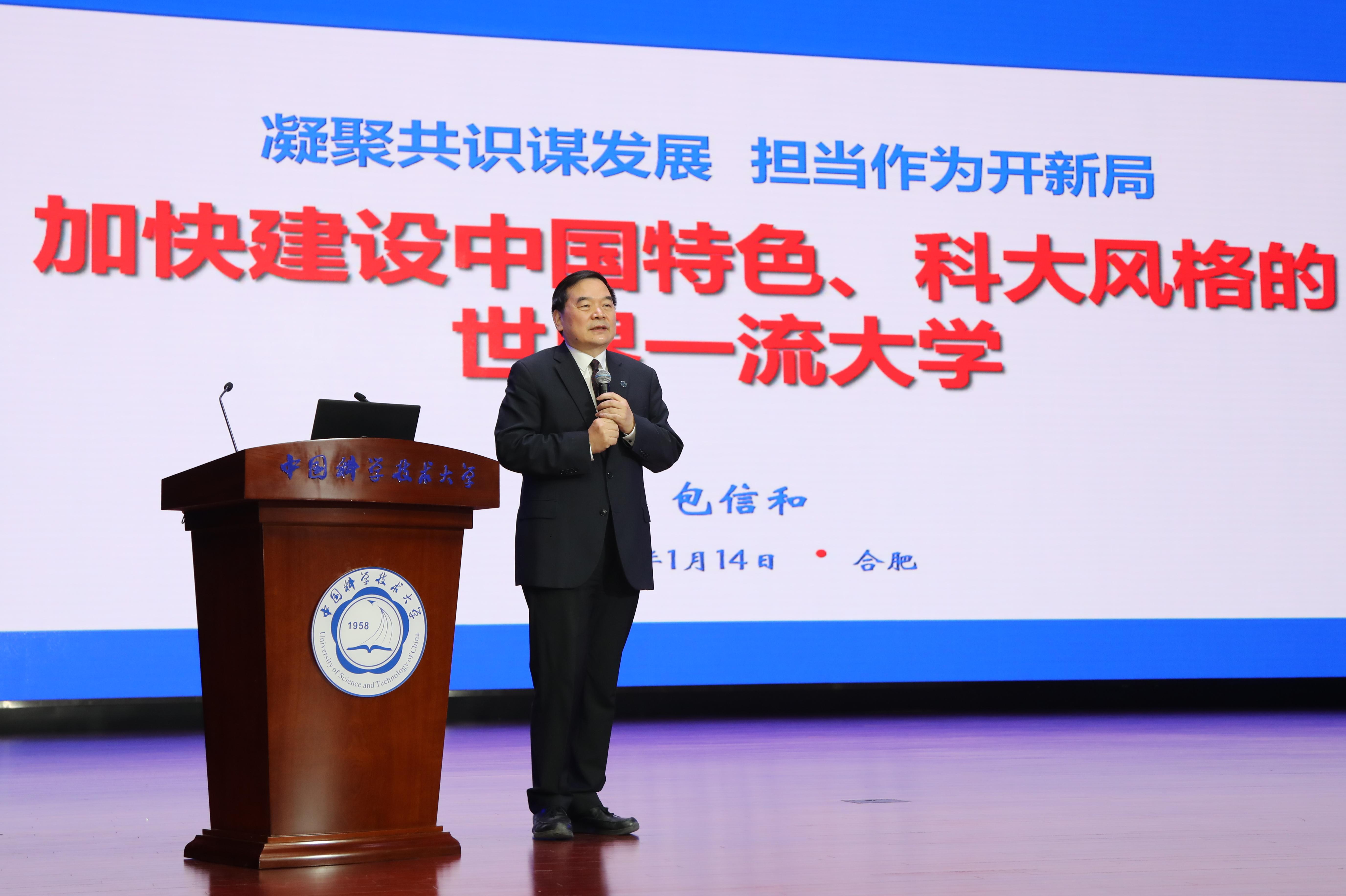 包信和分析了当前形势,明确了学校未来的指导思想和发展目标,提出了“十四五”期间建设任务和初步设想。他强调,要科学谋划“十四五”发展,以本为本、培养全面发展的一流创新人才,深化研究生教育改革、完善高层次人才培养体系,坚持人才强校主战略、打造一流师资队伍,优化学科布局、形成一流学科生态,强化国家战略科技力量使命担当,优化“率先行动”第二阶段重点布局方向,规划建设“十四五”科教基础设施,推进合肥先进光源建设,服务国家和区域发展战略,进一步完善校区功能,完善大外事工作格局、提升国际影响力,建设世界一流的现代大学校园。包信和提出几点思考:如何做好“全院办校、所系结合”和科教融合,如何积极应对百年不遇之大变局,厘清人才培养、科学研究以及社会服务中的几项重要关系。包信和指出,凝聚共识谋发展,担当作为开新局。要以习近平新时代中国特色社会主义思想为指导,牢记习近平总书记的嘱托,潜心立德树人,执着攻关创新,争取将中国科大率先建成中国特色、科大风格的世界一流大学。