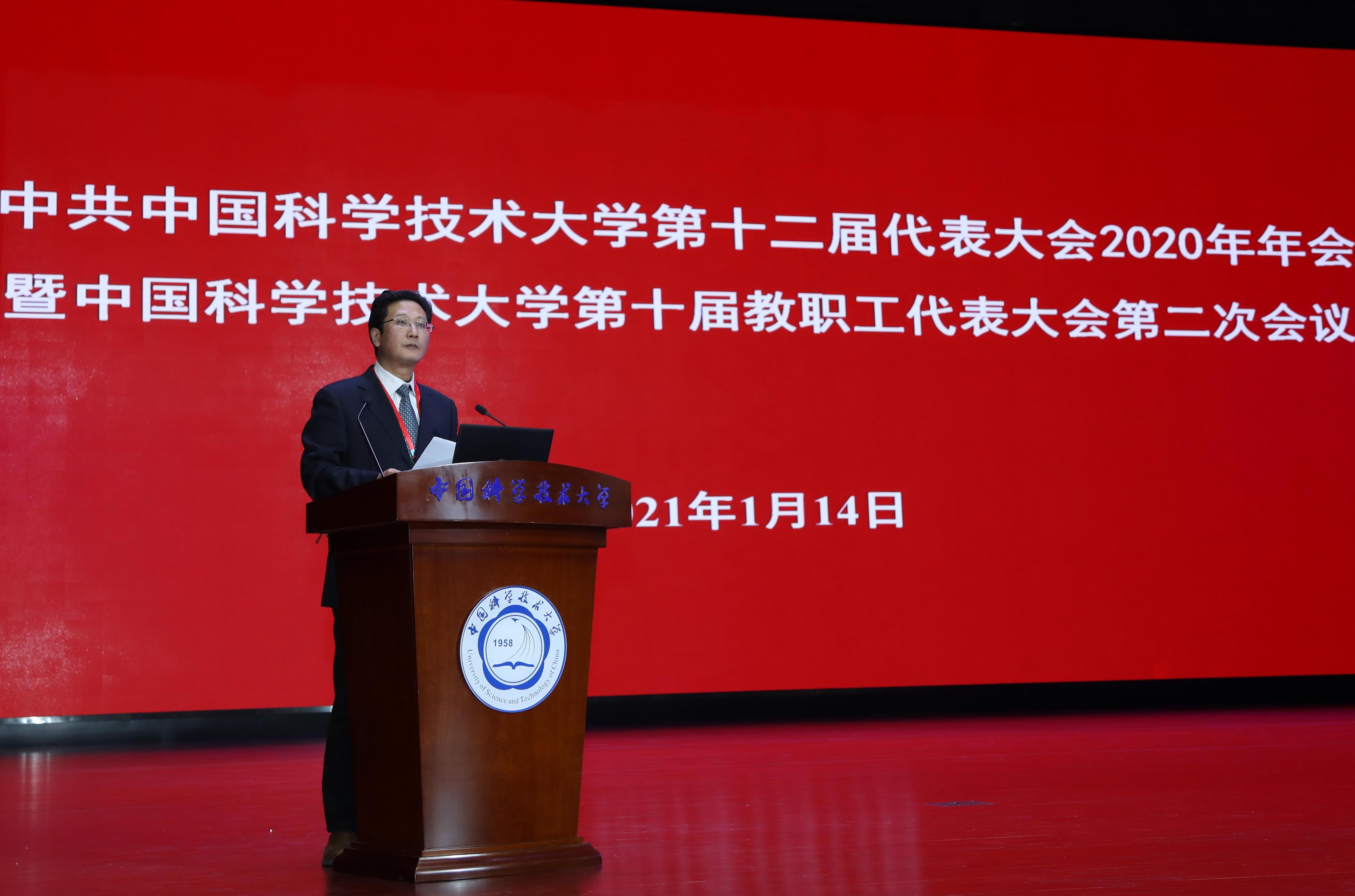 舒歌群从七个方面回顾了2020年党委的主要工作:以习近平新时代中国特色社会主义思想为指导,牢牢把握正确办学方向;充分发挥党委领导作用,加强领导班子自身建设;扎实推进新时代党建“双创”,落实党建主体责任;凝心聚力,为推进“潜心立德树人、执着攻关创新”核心任务提供组织和政治保障;落实意识形态工作责任制,营造良好舆论氛围;巩固深化主题教育成果,推进全面从严治党;做好统战和离退休工作,加强对工会的指导,做好社会服务工作。舒歌群强调,校党委坚持把党的政治建设摆在首位,以习近平总书记关于中国科大系列重要指示精神为指引,坚决打赢疫情防控阻击战,在推动学校“双一流”建设,坚持和完善党委领导下的校长负责制,打造一支忠诚干净担当的高素质干部队伍,大力培养德智体美劳全面发展的“六有”大学生,营造执着攻关创新的良好氛围,建立爱国主义教育体系、落实意识形态工作责任制、加强新闻宣传工作等多方面取得了良好成效。