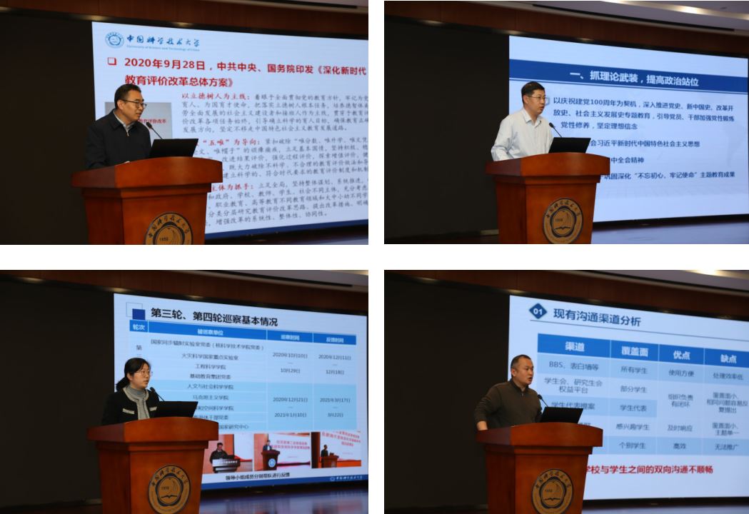 会上,党政办公室主任王伟对学校深化新时代教育评价改革工作进行了汇报;党委组织部常务副部长邓建松对学校近期党建工作安排进行了汇报;党委宣传部常务副部长朱霁平汇报了学校党史学习教育与意识形态工作安排;党委巡察工作办公室副主任汤茜报告了第三轮、第四轮校内巡察的有关情况;团委副书记赵林介绍了学生在线沟通渠道的初步方案。